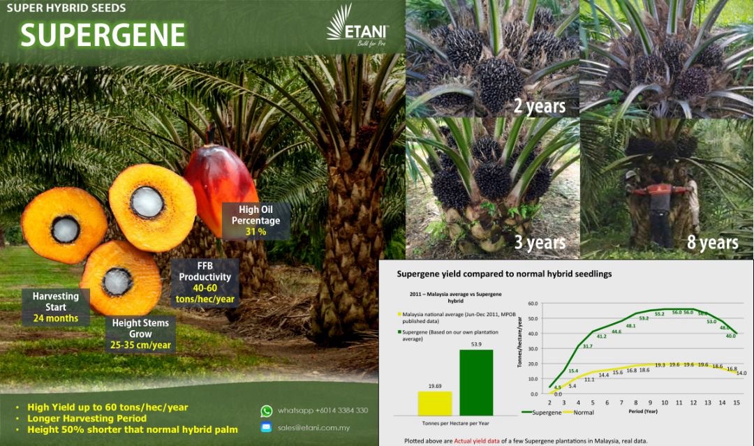 The super hybrid oil palm seedling is currently the most advanced variety of all oil palm seedlings. It starts producing from 2.5years, it is dwarf in nature with a production of 12-45 bunches per stand. It has a lifespan of upto 47years.
